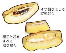 ペトペトした皮が滑りやすりので、両端を切り落とした後にピーラーで皮を剥くと作業しやすいです。